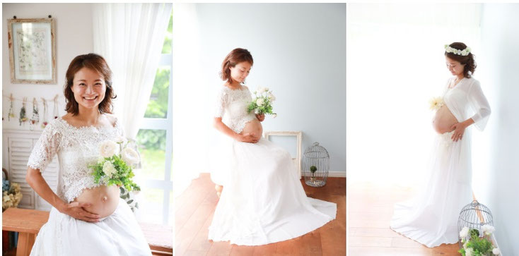 白いシフォンのスカートとチューブブラ、二の腕や背中をすっきりと隠せるマタニティフォト用のレースのドレス、シフォンのカーディガンもお使いいただけます。